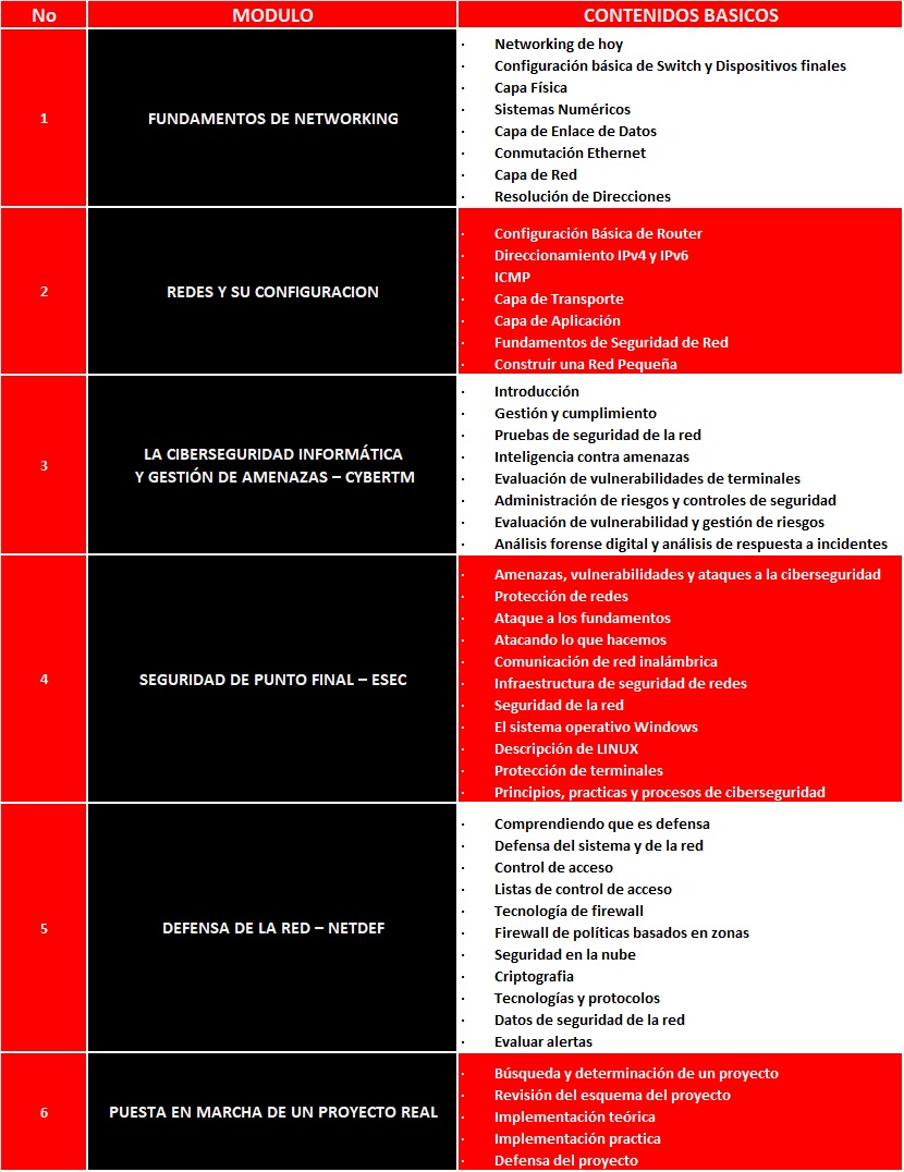 - Desarrollar habilidades técnicas y competencias prácticas que permitan a los participantes diseñar, implementar y administrar sistemas de redes seguras, así como detectar y mitigar riesgos y amenazas cibernéticas.
